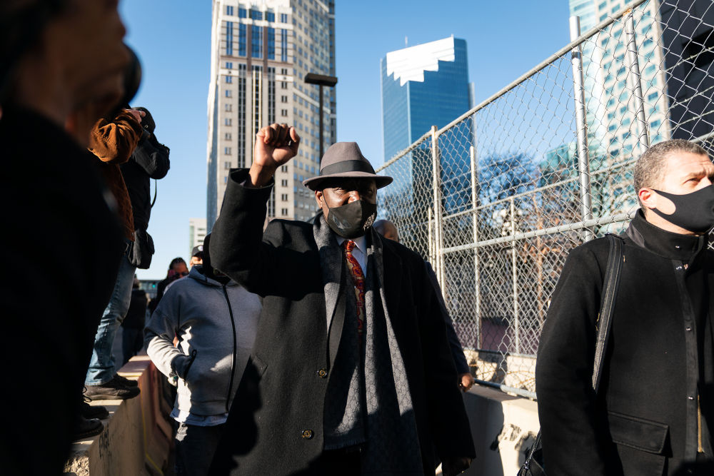 3月29日,弗洛伊德家人的律师本杰明·克伦普(中)在进入位于美国明尼阿波利斯市的法庭前举起手臂。(新华社发,本·布鲁尔摄)