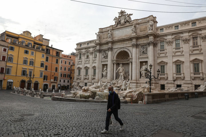4月3日,当地居民走过意大利罗马的许愿池。新华社记者程婷婷摄