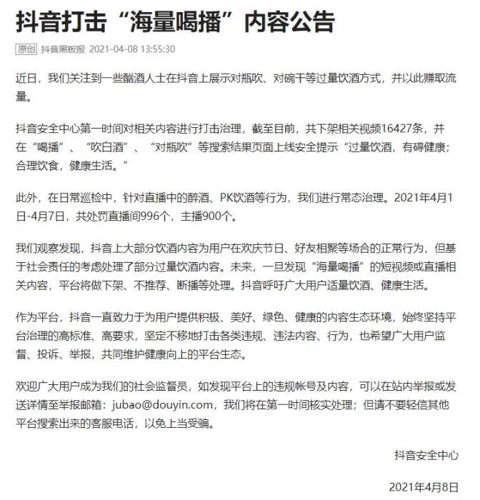 4月8日发布的《抖音打击“海量喝播”内容公告》称,抖音安全中心第一时间对相关内容进行打击治理,截至目前,共下架相关视频16427条,并在“喝播”、“吹白酒”、“对瓶吹”等搜索结果页面上线安全提示“过量饮酒,有碍健康;合理饮食,健康生活”。2021年4月1日-4月7日,共处罚直播间996个,主播900个。
