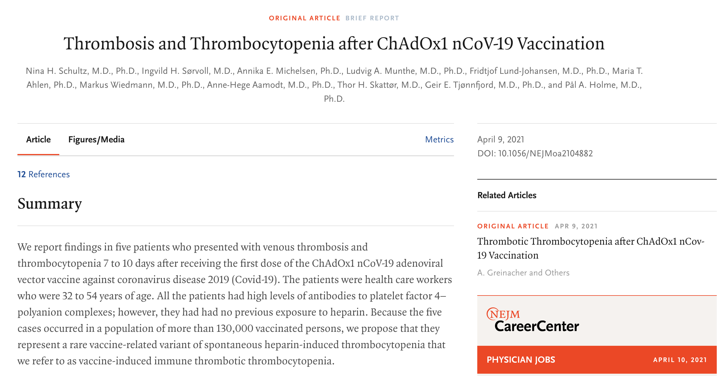 该研究已经于9日在《新英格兰医学杂志》上发表。研究结果表明,5位患者的共同点是血小板因子4(PF4)和聚阴离子的复合物的抗体水平都非常高,这些类型的抗体可以激活并导致血小板数值低,研究人员将其称为疫苗诱导的免疫性血小板减少症(VITT)。