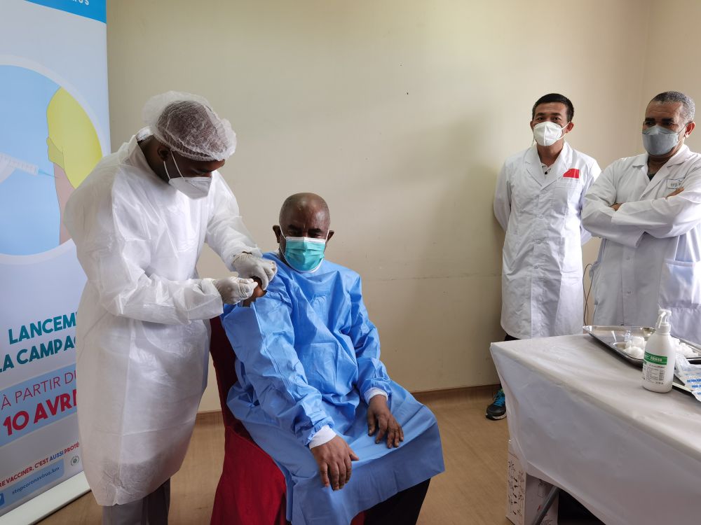 4月10日,科摩罗总统阿扎利(左二)在位于莫罗尼北部的埃尔·马鲁夫医院接种第一剂由中国国药集团生产的新冠疫苗。(新华社发,韩林摄)