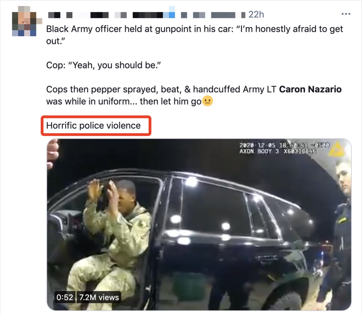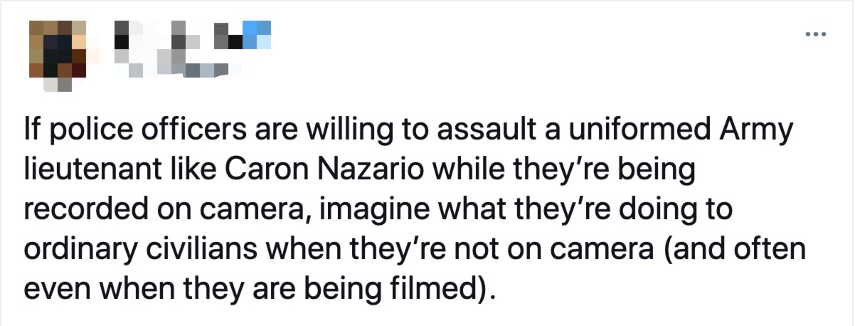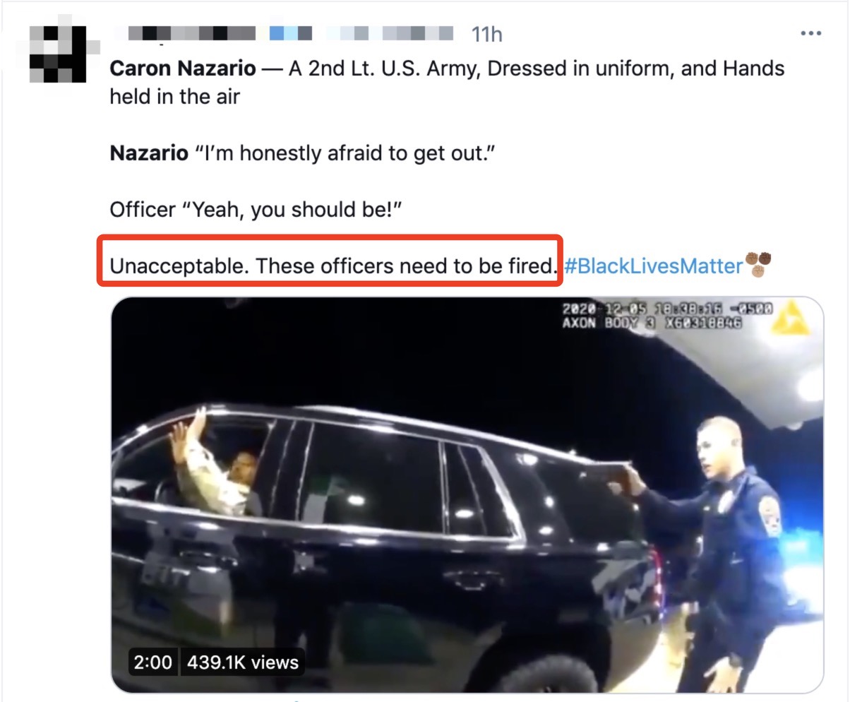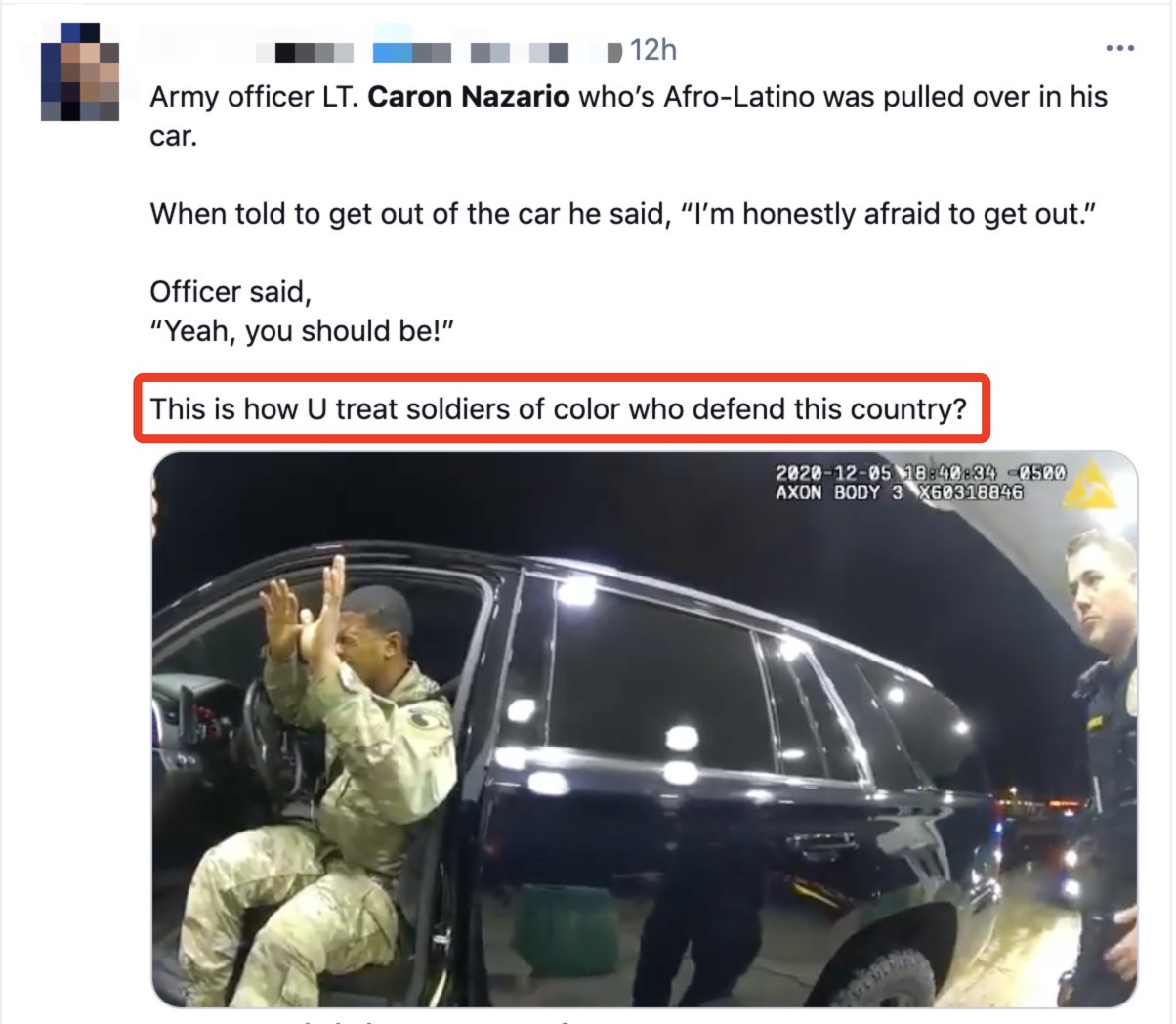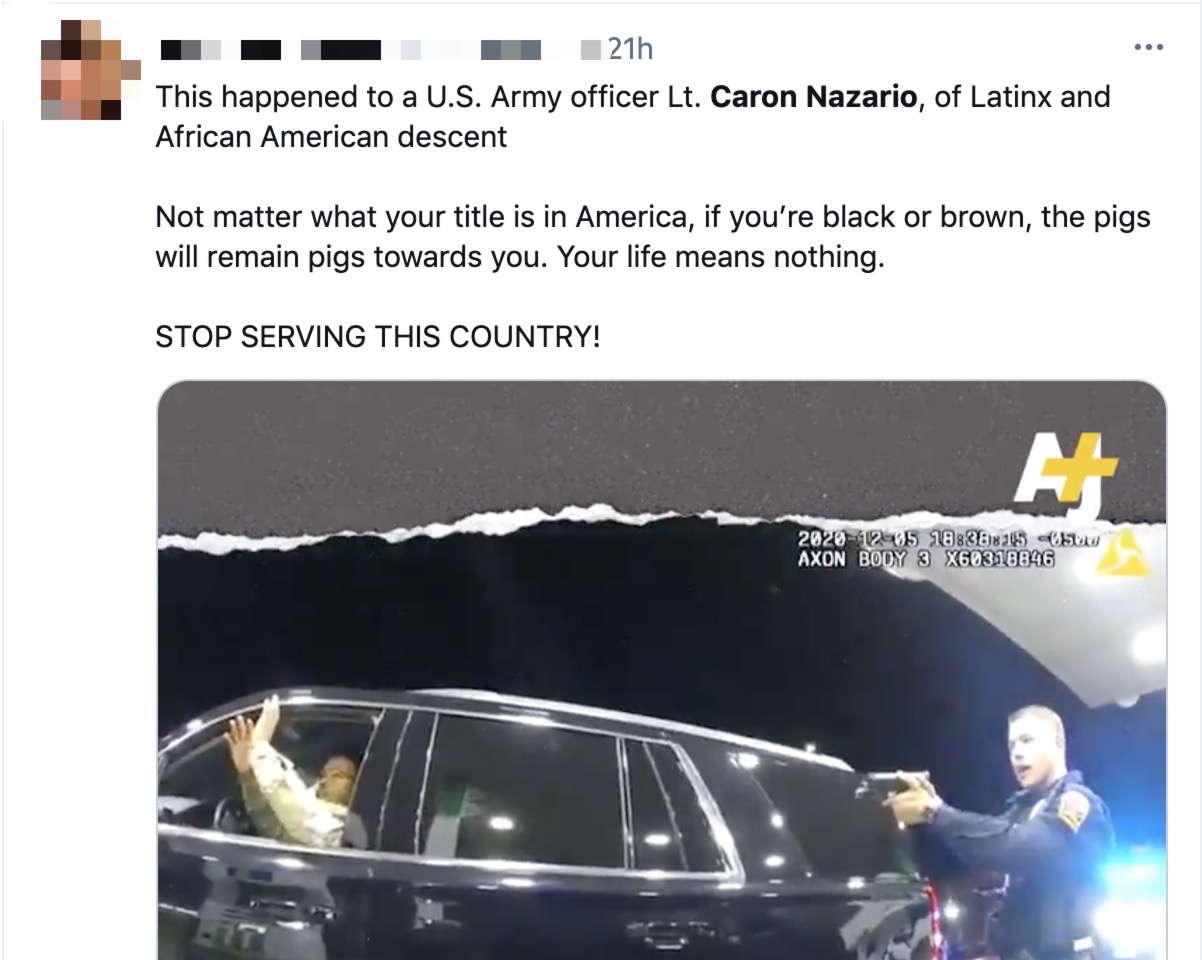 网民:“这就是发生在美国拉丁裔和非洲裔混血的陆军军官纳扎里奥身上的事。在美国,不管你的头衔是什么,如果你的肤色是黑色或棕色……你的生命就毫无意义。别再为这个国家服务了!”↓↓↓