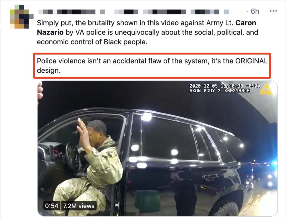 网民:“这段视频中,弗吉尼亚州的警察对纳扎里奥的暴行明确地反映了对非洲裔在社会、政治和经济方面的控制。警察暴力不是这一制度的偶然缺陷,它是初始设计。”↓↓↓