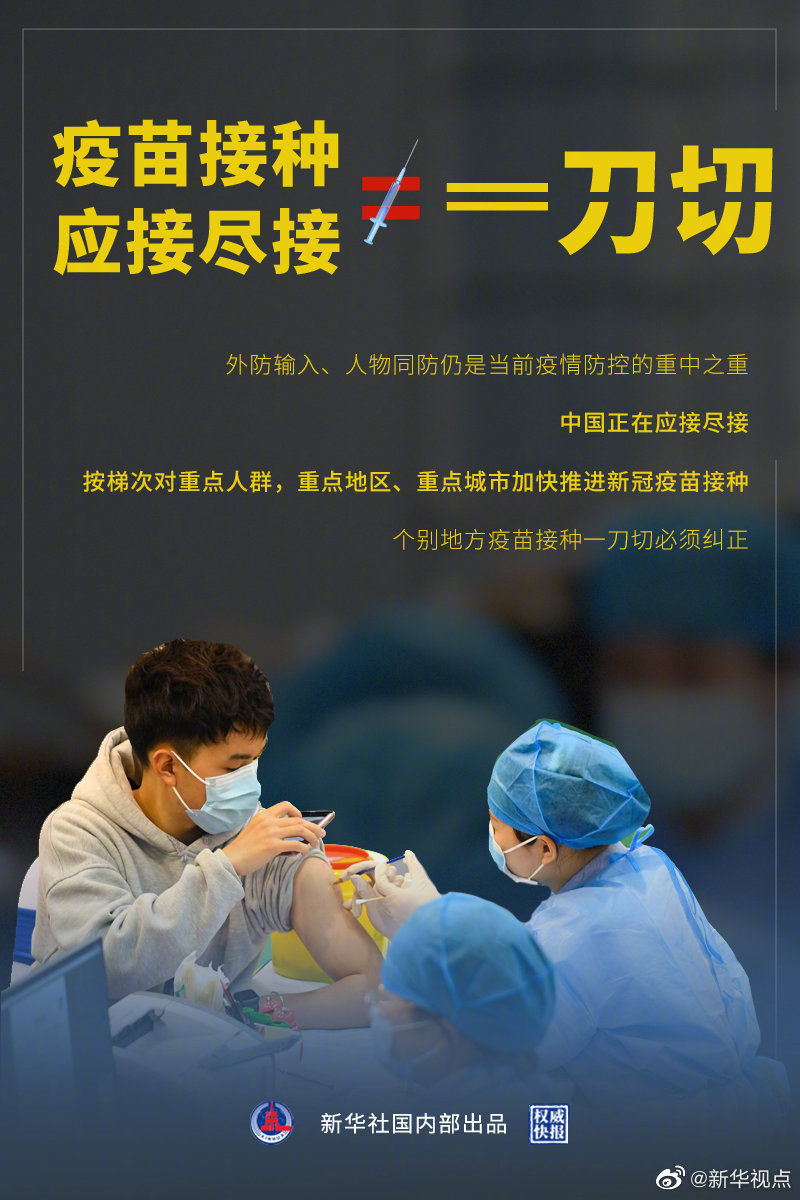 【权威快报|疫苗接种应接尽接不等于一刀切】国家卫健委新闻发言人米锋11日在国务院联防联控机制新闻发布会上表示,近期,全球疫情再次反弹,我国边境城市瑞丽出现了聚集性疫情,提示外防输入、人物同防仍是当前疫情防控的重中之重。中国目前正在应接尽接、按梯次,对重点人群,重点地区、重点城市加快推进新冠疫苗接种。截至4月10日24时,全国累计报告接种新冠疫苗16447.1万剂次。他指出,针对个别地方接种工作中出现了简单化,甚至一刀切的情况,强制要求全员接种,必须坚决予以纠正。(记者彭韵佳、徐鹏航 海报设计张晨光)