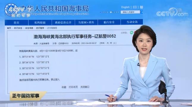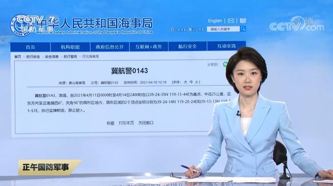 央视网消息:据中国海事局网站消息,唐山海事局发布航行警告,4月11日0时至4月14日24时,渤海部分海域执行实弹射击。禁止驶入。