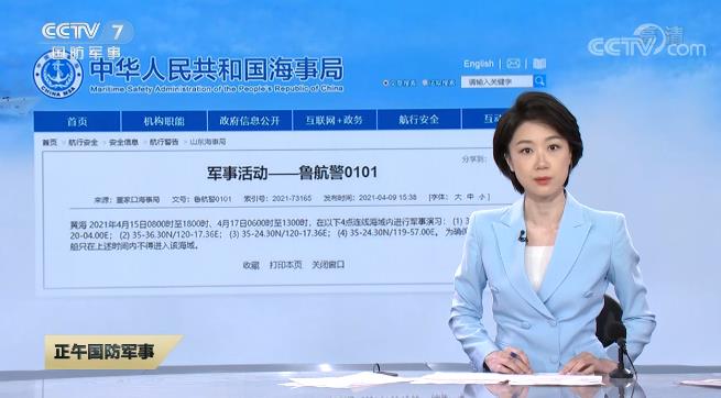 据海事局网站消息,山东海事局发布航行警告,4月15日8时至18时、4月17日6时至13时,在黄海海域内进行军事演习。为确保安全,任何船只在上述时间内不得进入该海域。