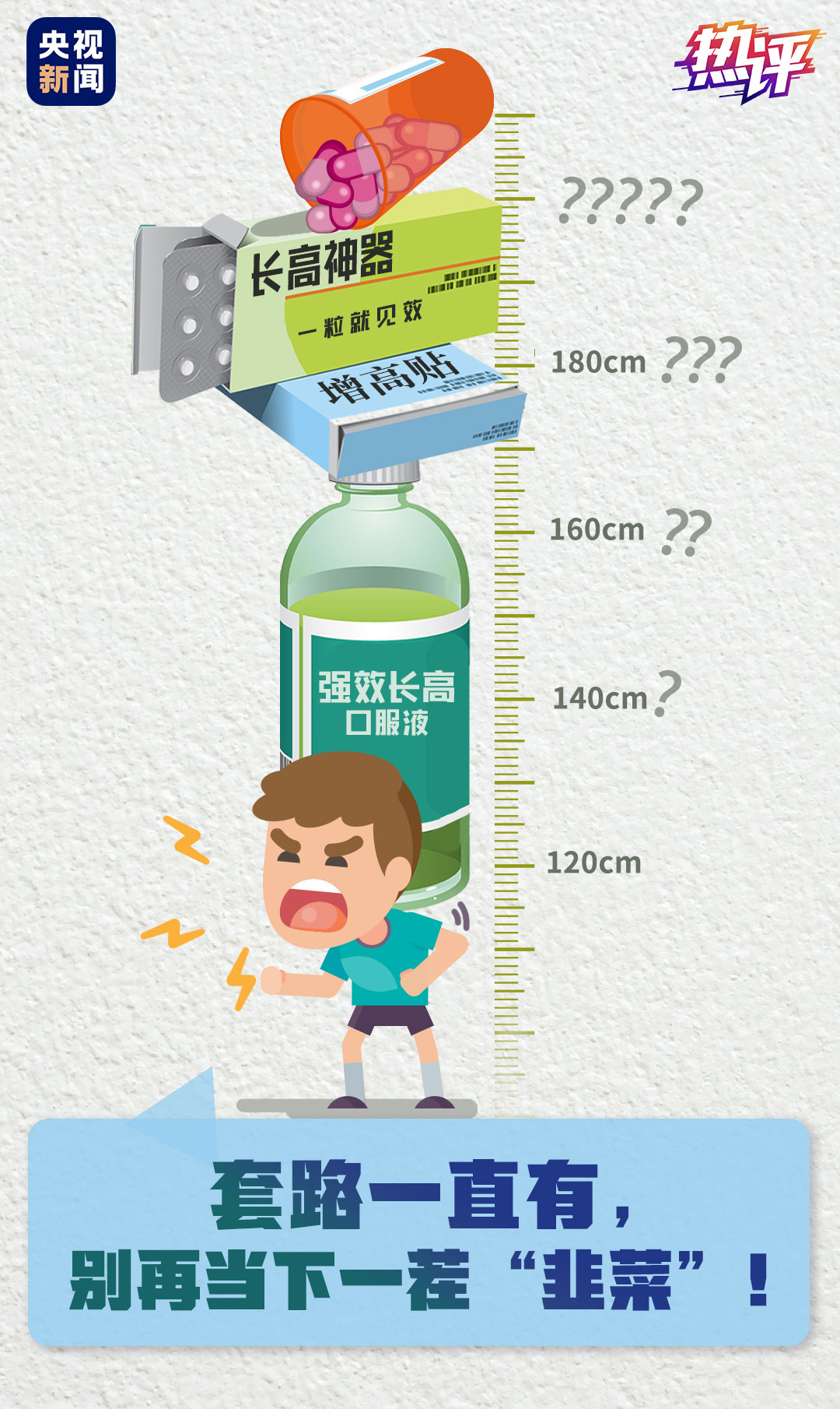 “增高”套路多年前就存在,不良效果案例也曾发生,为何至今仍能收割一茬茬“韭菜”?总是让人中招的套路无非如此:首先制造身高焦虑,“以后找工作碰壁”“被同龄人嘲笑”“找不到对象”……商家以这些刺激性语句贩卖焦虑,为推销做好铺垫;接下来夸大宣传疗效。“再高10—15厘米”“突破极限”……神乎其神的广告语,让消费者以为找到了解药。其实,专家的科学意见是:要让孩子充分自然生长。