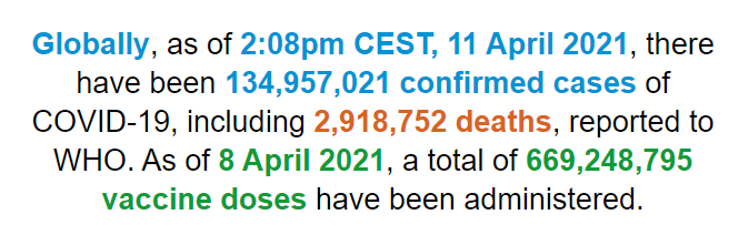 根据世卫组织最新实时统计数据,截至欧洲中部夏令时间4月11日14时8分(北京时间4月11日20时8分),全球累计新冠肺炎确诊病例134957021例,累计死亡病例2918752例。11日全球新冠肺炎确诊病例新增646863例,死亡病例新增10712例。(总台记者 朱赫)