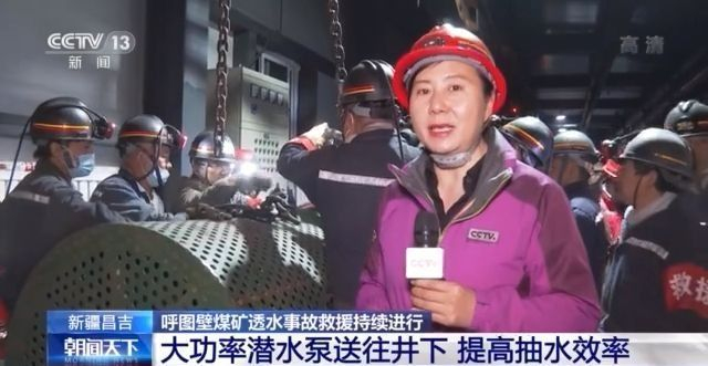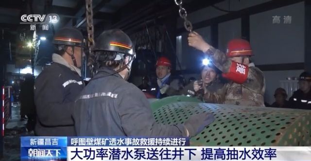 总台记者 崔宁:这是一台抽水能力为每小时725立方米的潜水泵,救援人员正在通过上面这个单轨吊把它运往井下,投入使用后,可以使整个救援现场的抽水能力高出将近一倍。