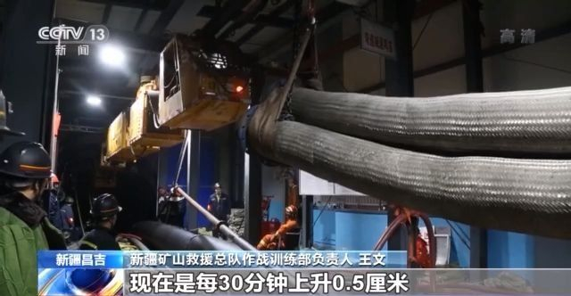 新疆矿山救援总队作战训练部负责人 王文:对井下的被困人员,如果瓦斯、一氧硫化氢的气体如果说有超标的可能性,会对井下被困人员造成气体情况的危险,但现在唯一一个好处是它的氧气含量,目前监测到的数据是20%以上。但水位还是不断的上升,现在是每30分钟上升0.5厘米,前期是每半个小时上升3厘米、3.5厘米,上涨速度较前期是有下降趋势的。
