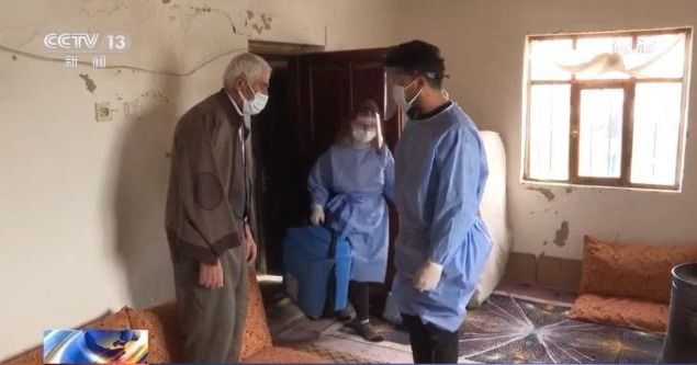 医护人员向老人解释了相关注意事项后为他接种了第一剂中国新冠疫苗。此前,医护人员曾经两次尝试来到伊德里斯家为他接种,但因为天气恶劣、道路封闭而被迫放弃。