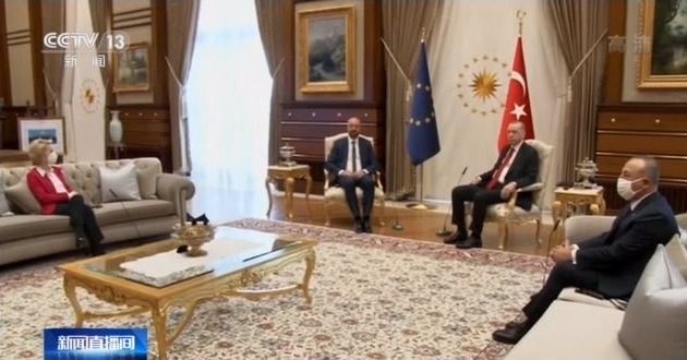 土耳其总统埃尔多安6日在首都安卡拉与到访的欧洲理事会主席米歇尔以及欧盟委员会主席冯德莱恩举行会谈。位于总统府的会晤现场,土耳其国旗和欧盟旗帜前各摆放了一把椅子。随后,埃尔多安和米歇尔主动坐在了椅子上,冯德莱恩不得不落座于与二人距离稍远的沙发上。土耳其官方以一把椅子“接待”两名欧盟领导人招致欧盟方面不满。美国媒体此前也报道称,这种做法不符合传统外交礼仪。