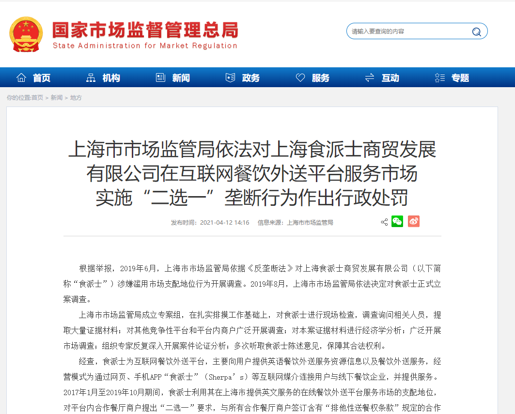 综合考虑食派士违法行为的性质、程度和持续时间等因素,依据《反垄断法》第四十七条、第四十九条、《行政处罚法》第二十七条之规定,2020年12月25日,上海市市场监管局依法作出行政处罚决定,对食派士处以其2018年销售额3%的罚款,合计人民币116.86万元。