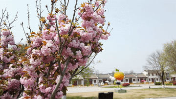 白墙灰瓦、绿树成荫、溪流潺潺、野蜂飞舞