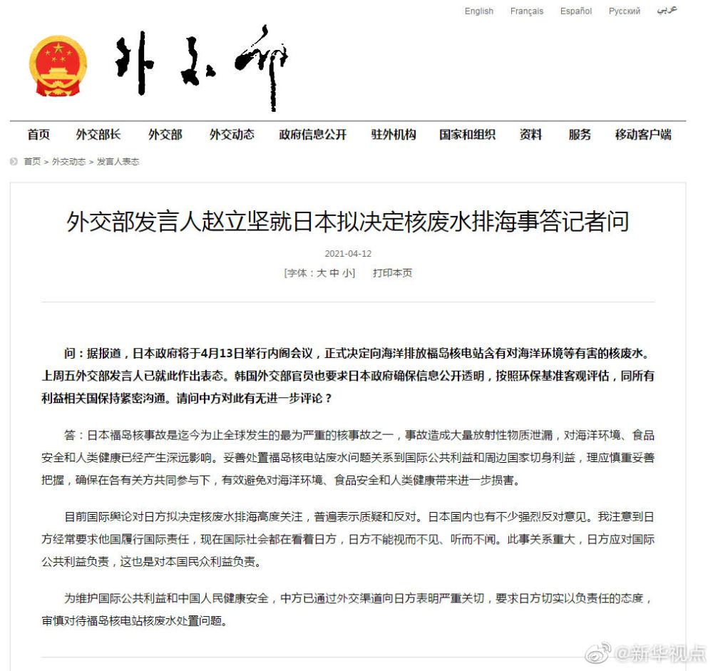 【赵立坚回应日本拟决定核废水排海】外交部发言人赵立坚4月12日说,国际舆论对日方拟决定核废水排海高度关注,普遍表示质疑和反对。日本国内也有不少强烈反对意见。我注意到日方经常要求他国履行国际责任,现在国际社会都在看着日方,日方不能视而不见、听而不闻。中方已通过外交渠道向日方表明严重关切,要求日方切实以负责任的态度,审慎对待福岛核电站核废水处置问题。