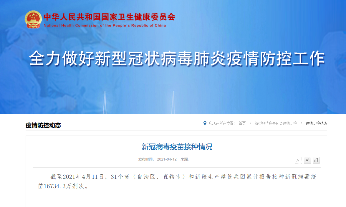 央视网消息:据国家卫健委网站消息,截至2021年4月11日,31个省(自治区、直辖市)和新疆生产建设兵团累计报告接种新冠病毒疫苗16734.3万剂次。