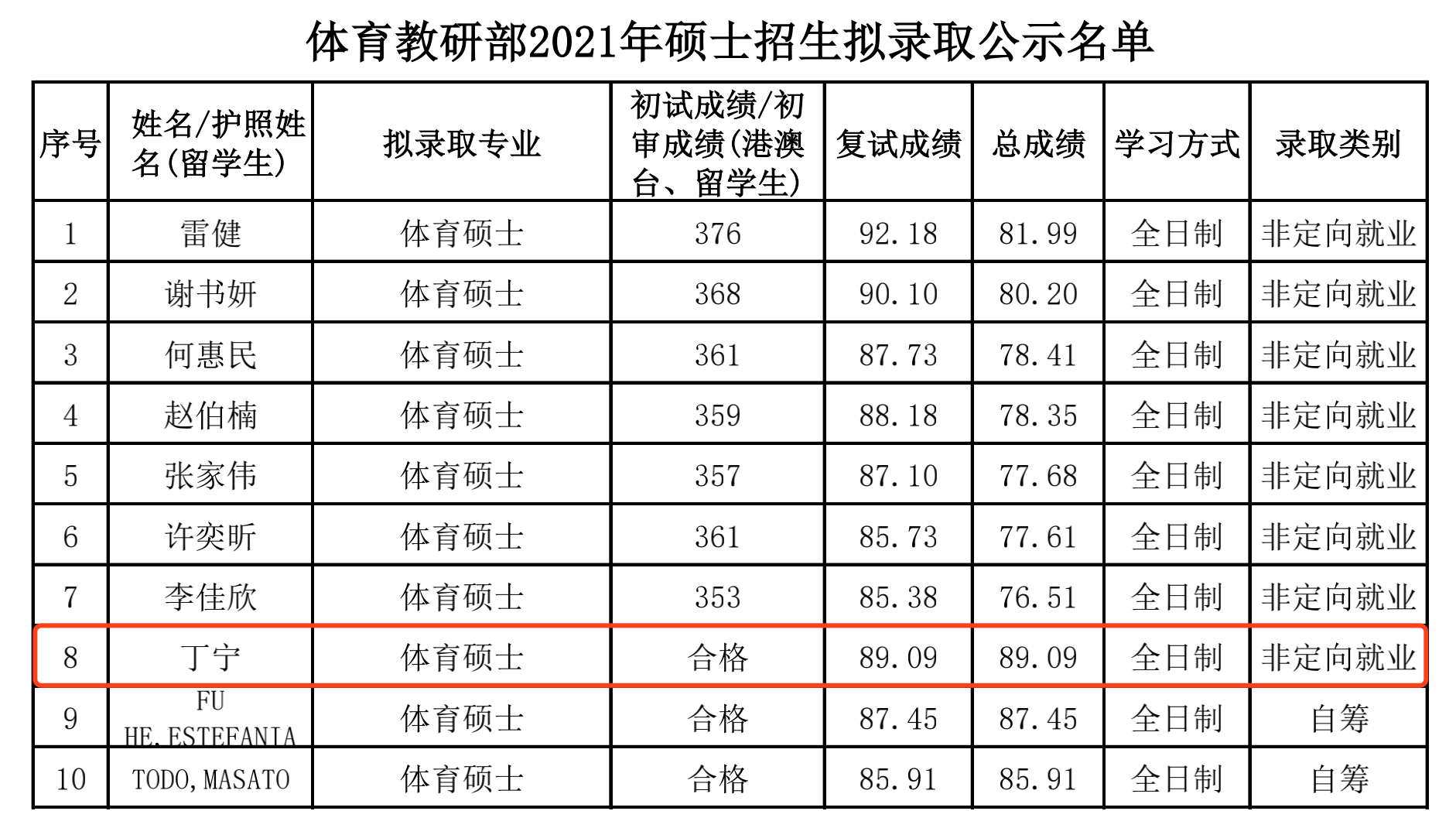 丁宁不久前代表北京队参加了全运会预赛,去年乒超联赛她以教练兼队员的身份参赛。丁宁即将前往北大就读全日制硕士,做好了转型的准备。公示名单显示,丁宁的复试成绩为89.09分,她将成为全日制非定向就业学生。