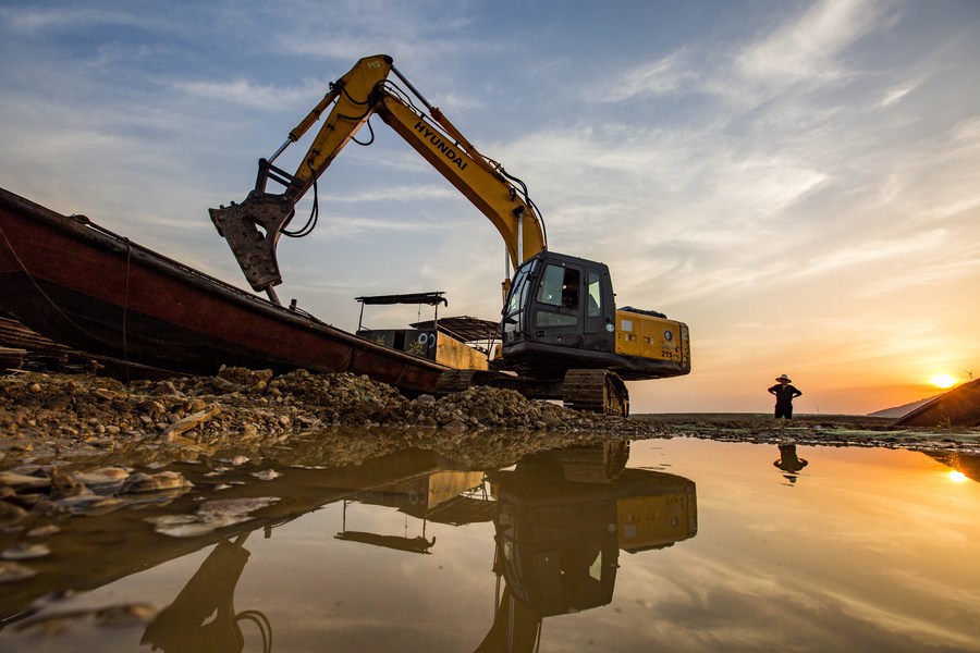 2020年4月26日,在鄱阳湖都昌矶山附近水域渔船集中存放区,挖掘机在拆解渔船。傅建斌摄