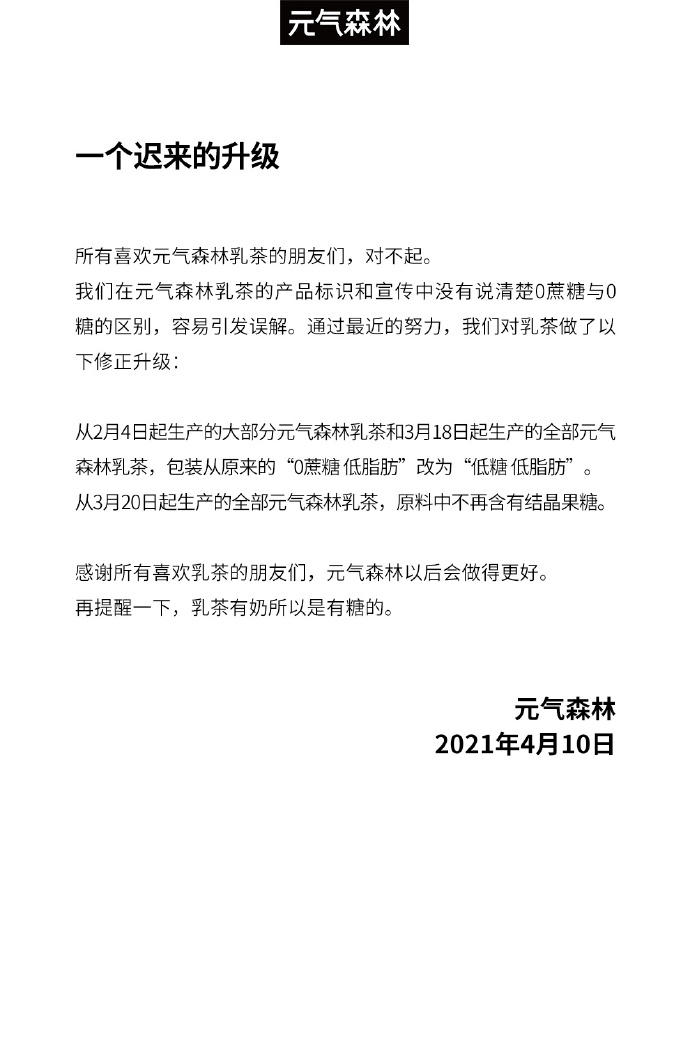 4月10日晚,饮料品牌元气森林发布道歉声明称,在乳茶产品的产品标识和宣传中,没有说明“0糖”和“0蔗糖”的区别,容易引发误解。从2月4日起生产的大部分乳茶和3月18日起生产的全部乳茶,包装从原来的“0蔗糖 低脂肪”改为“低糖 低脂肪”。同时提醒消费者:乳茶有奶所以是有糖的。