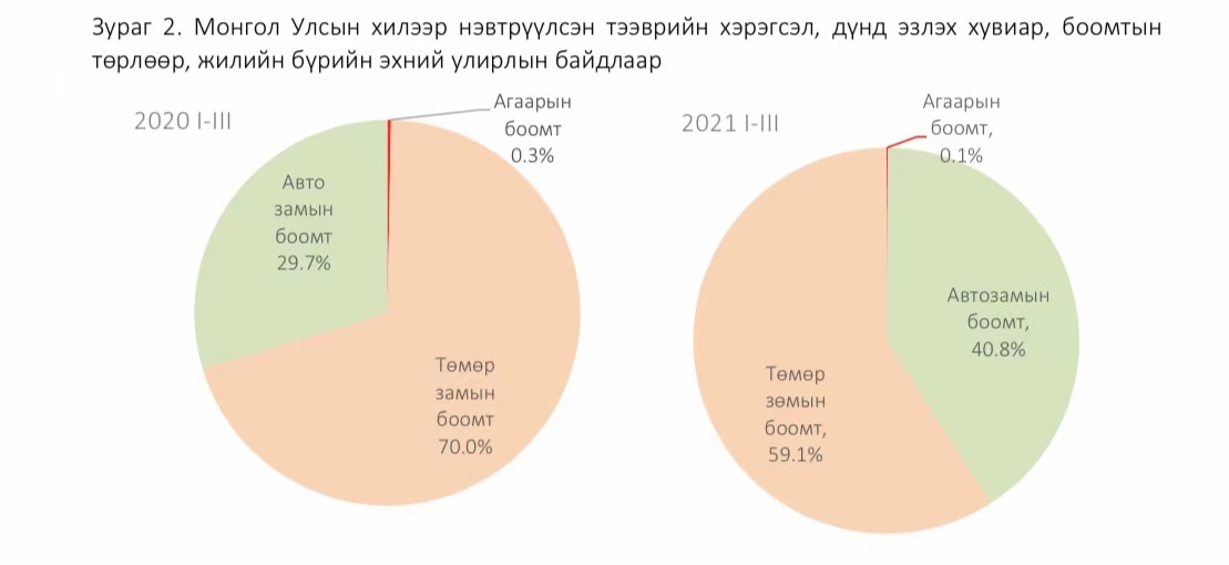 △2021年第一季度蒙古国出入境交通工具比例示意图(图片来源:蒙古国国家统计委员会官网)