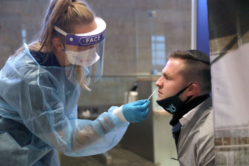 3月8日,旅客抵达以色列本古里安国际机场后接受新冠检测采样。(新华社/基尼图片社)