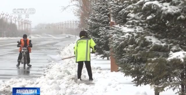 当地环卫工人和环卫部门出动的大型清雪设备对城区道路进行清雪作业。目前,降雪已经停止。