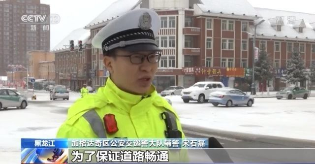 加格达奇区公安交巡警大队辅警 宋石磊:7点20我们就到岗了,为了保证道路畅通,联系的市政部门,重点路段撒的炉灰,全力保证道路安全畅通。