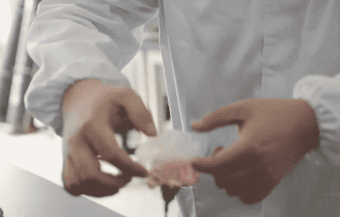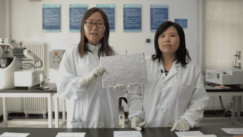技术人员展示气凝胶材料的超轻特性