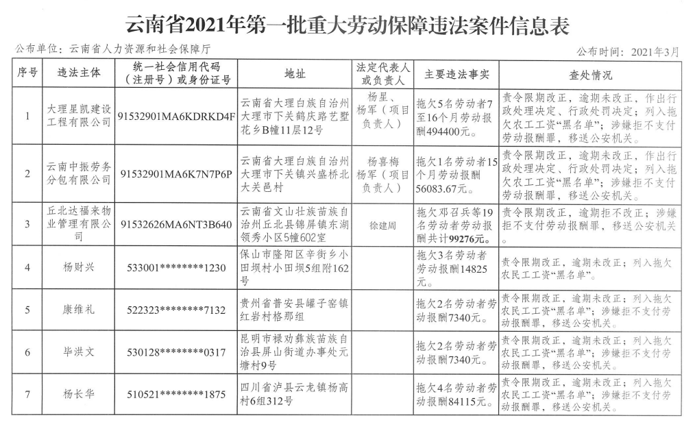 4月12日,总台记者从云南省人力资源和社会保障厅获悉,云南省人社厅向社会公布了一批重大劳动保障违法案件,本次公布的案件共7件,涉及3个用人单位和4个自然人。这些案件均是去年以来云南省部分州(市)、县(市、区)人力资源社会保障部门查处的工资支付类重大劳动保障违法案件,其中,6件因涉嫌拒不支付劳动报酬罪被移送公安机关侦办,6件被列入拖欠农民工工资“黑名单”。