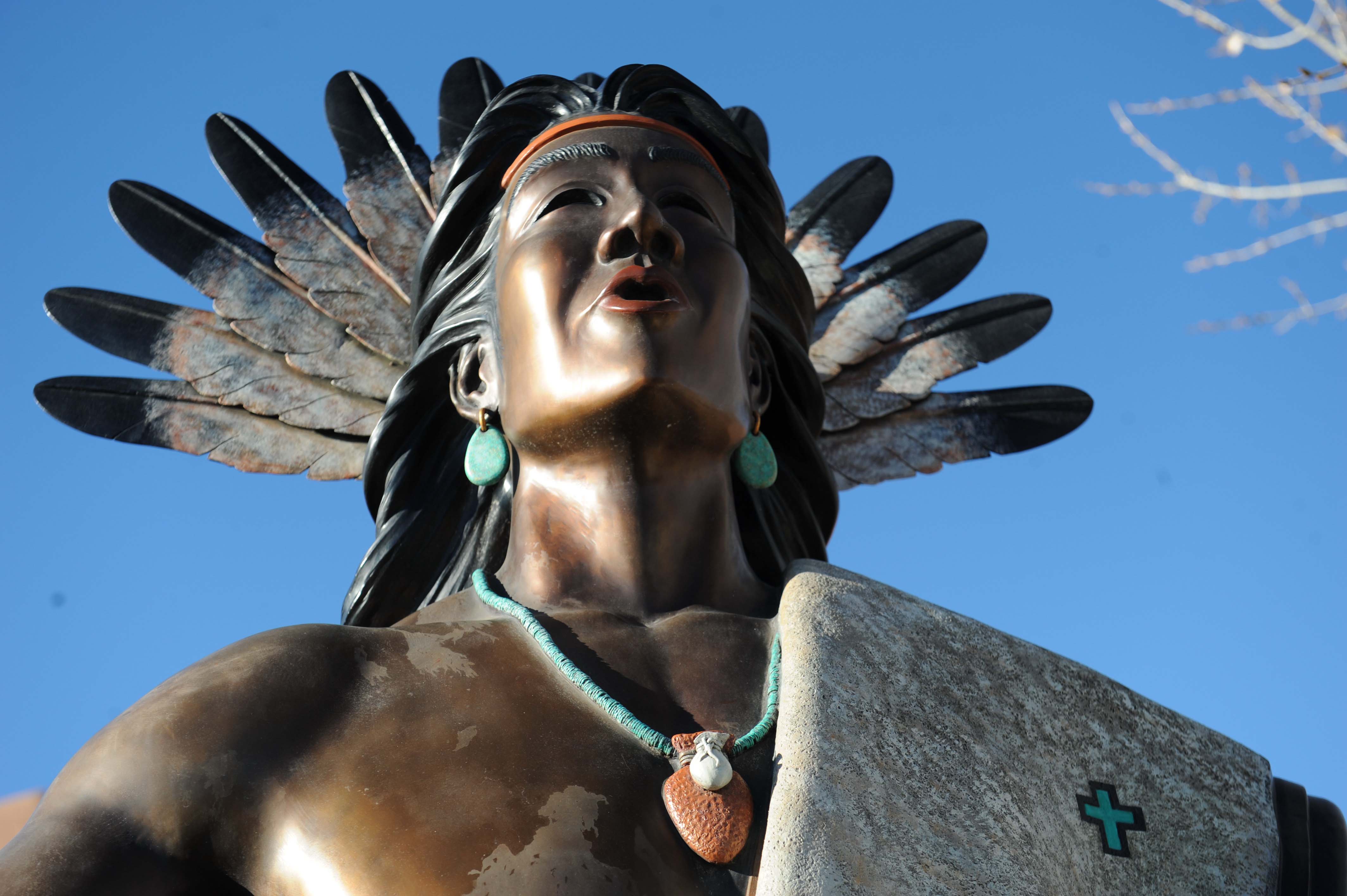 这是在美国新墨西哥州阿尔伯克基市的印第安部落博物馆门前拍摄的一个印第安人的雕塑。如今这种头顶羽毛、满脸纹饰的印第安人在美国已经不多见了。新华社记者谷欣容摄