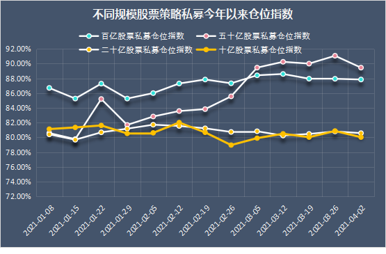 今年以来,百亿私募平均仓位水平为87.21%,明显高于其他规模私募,目前仓位指数同样高于今年的平均水平,较年初上升了1.14个百分点。