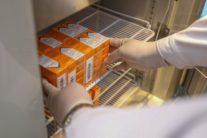 医护人员从移动疫苗接种车上的冷藏箱内取出新冠疫苗。新华社记者张玉薇 摄