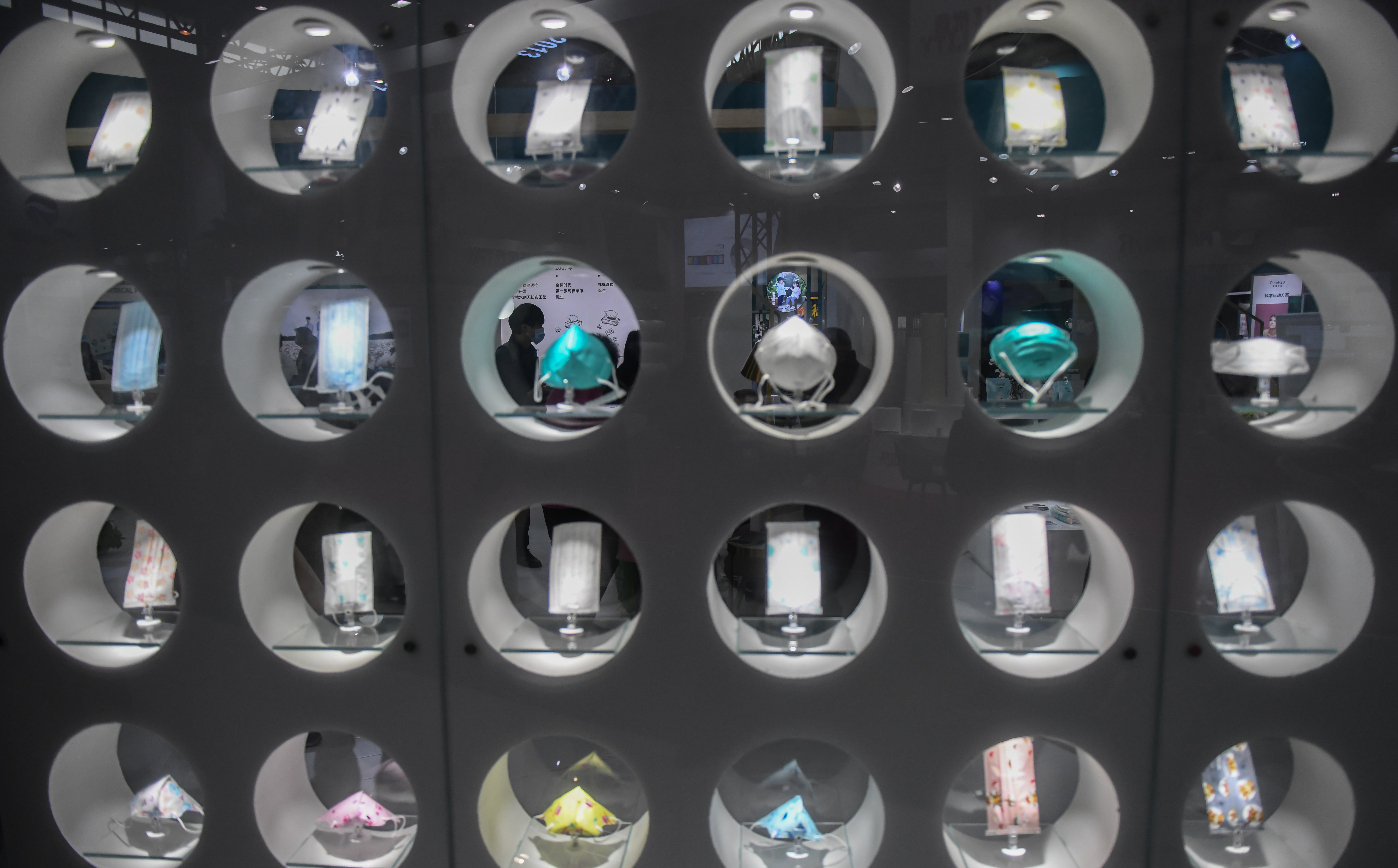 4月8日在武汉举行的第三届世界大健康博览会上,展出多种多样的口罩产品。 新华社记者 程敏 摄
