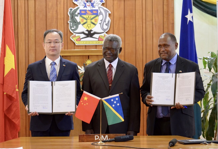 △中国驻所罗门群岛大使李明(左一)和所罗门群岛总理索加瓦雷(中)
