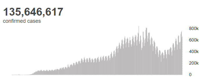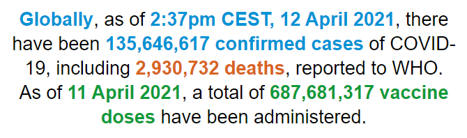 根据世卫组织最新实时统计数据,截至欧洲中部夏令时间4月12日14时37分(北京时间4月12日20时37分),全球累计新冠肺炎确诊病例135646617例,累计死亡病例2930732例。12日全球新增新冠肺炎确诊病例675707例,新增死亡病例11746例。(总台记者 朱赫)