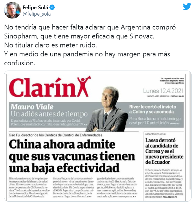 当天,阿根廷外长索拉在社交网络批评个别媒体使用错误表述,使民众对于中国疫苗产生误解。索拉认为,在疫情形势严峻的情况下,媒体不应再误导民众。目前阿根廷已经有539万人接种了新冠疫苗。随着4月1日第二批中国新冠疫苗抵达该国,并批准其在60岁以上人群使用,阿根廷疫苗派发和接种的速度也进一步加快,仅在上周就接种了约95万剂。(总台记者 刘欣)