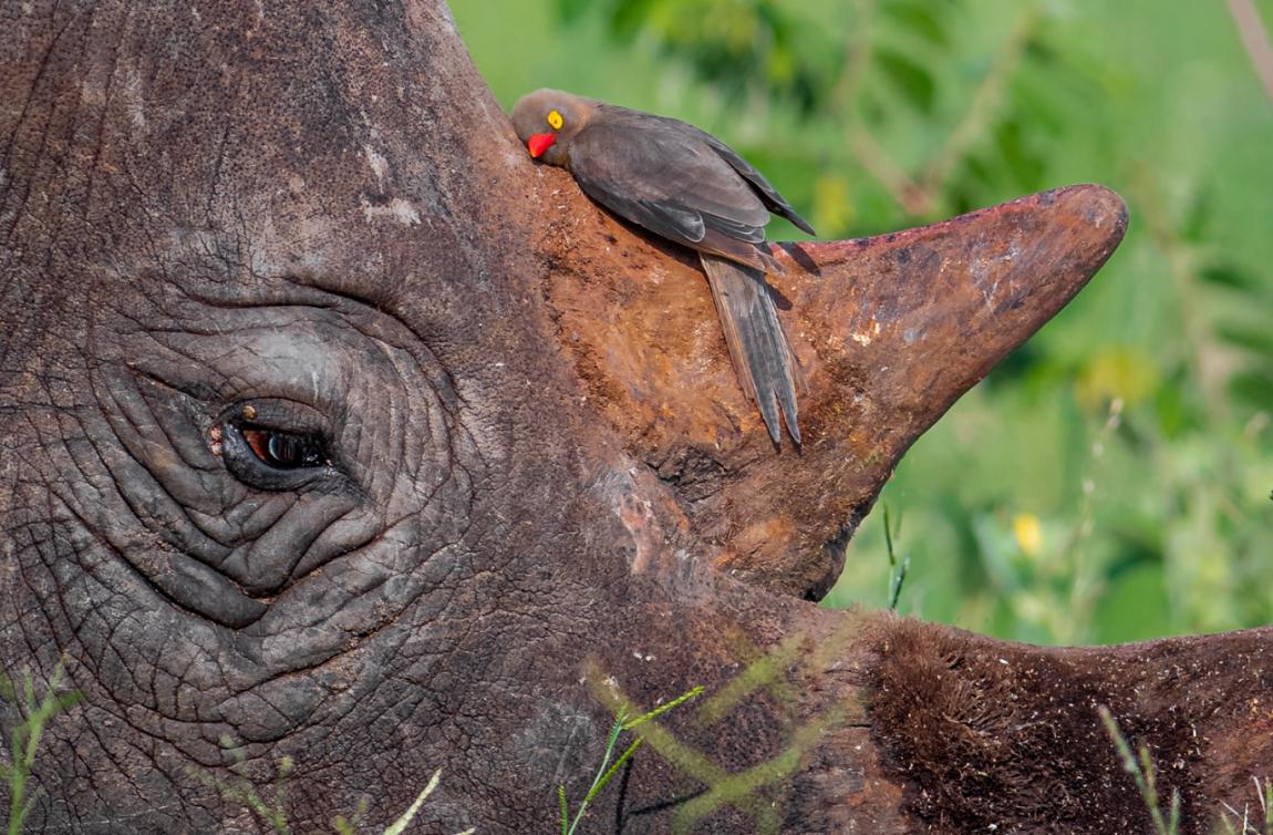 南非:牛椋鸟依偎犀牛角上小睡 和谐相处场面温馨。