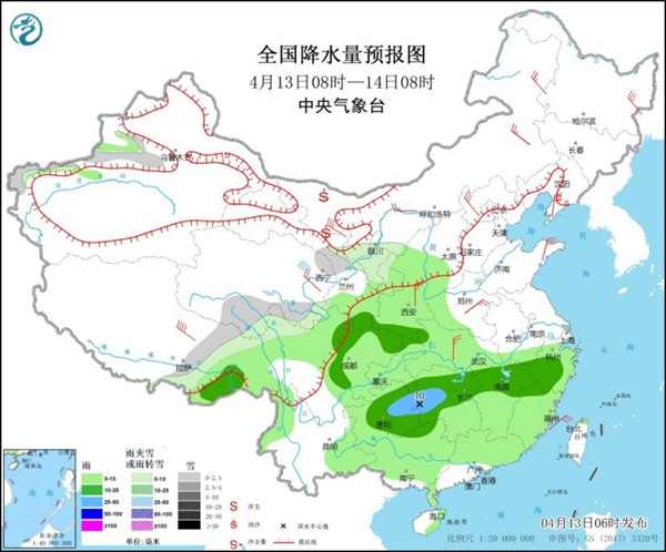 预计,今明两天(4月13日至14日),南方大部继续维持多阴雨的天气格局,江南地区雨势较强,之后降雨重心将逐渐南移,波及华南。在冷空气影响下,今天北方各地气温仍继续下跌,局地气温降幅将达10℃。