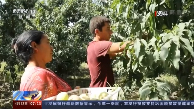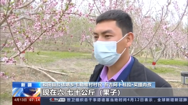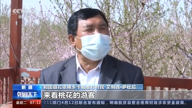和田县拉依喀乡卡勒维村村民 艾则孜·萨杜拉:来看桃花的游客等桃子熟了还回来买桃子,我们就有了两份收入,经济效益特别好。