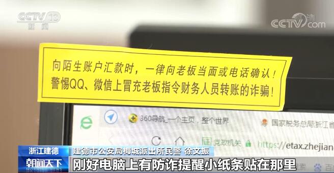 建德市公安局梅城派出所民警 徐文振:刚好电脑上有防诈小纸条贴在那里,这个企业的出纳人员也长了个心眼,没有那么及时把这个钱转出去,我们到现场后了解了这个账户信息,包括聊天情况之后,我们就定性了这就是诈骗案件,所以就及时把转账流程终止了。