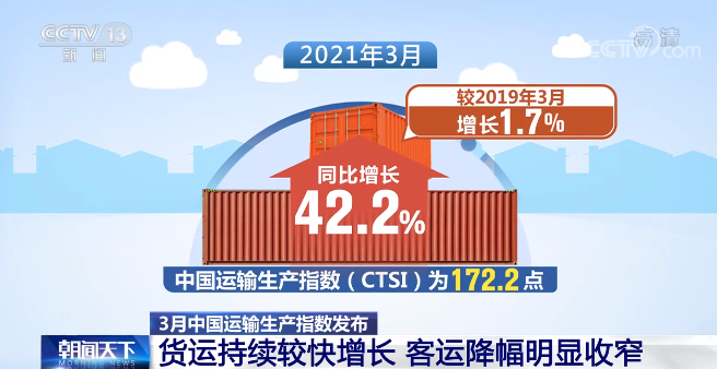 央视网消息:在昨天(12日),交通运输部科学研究院发布3月中国运输生产指数(CTSI)。数据显示,3月CTSI指数总体呈现货运持续较快增长、客运降幅明显收窄的发展态势。