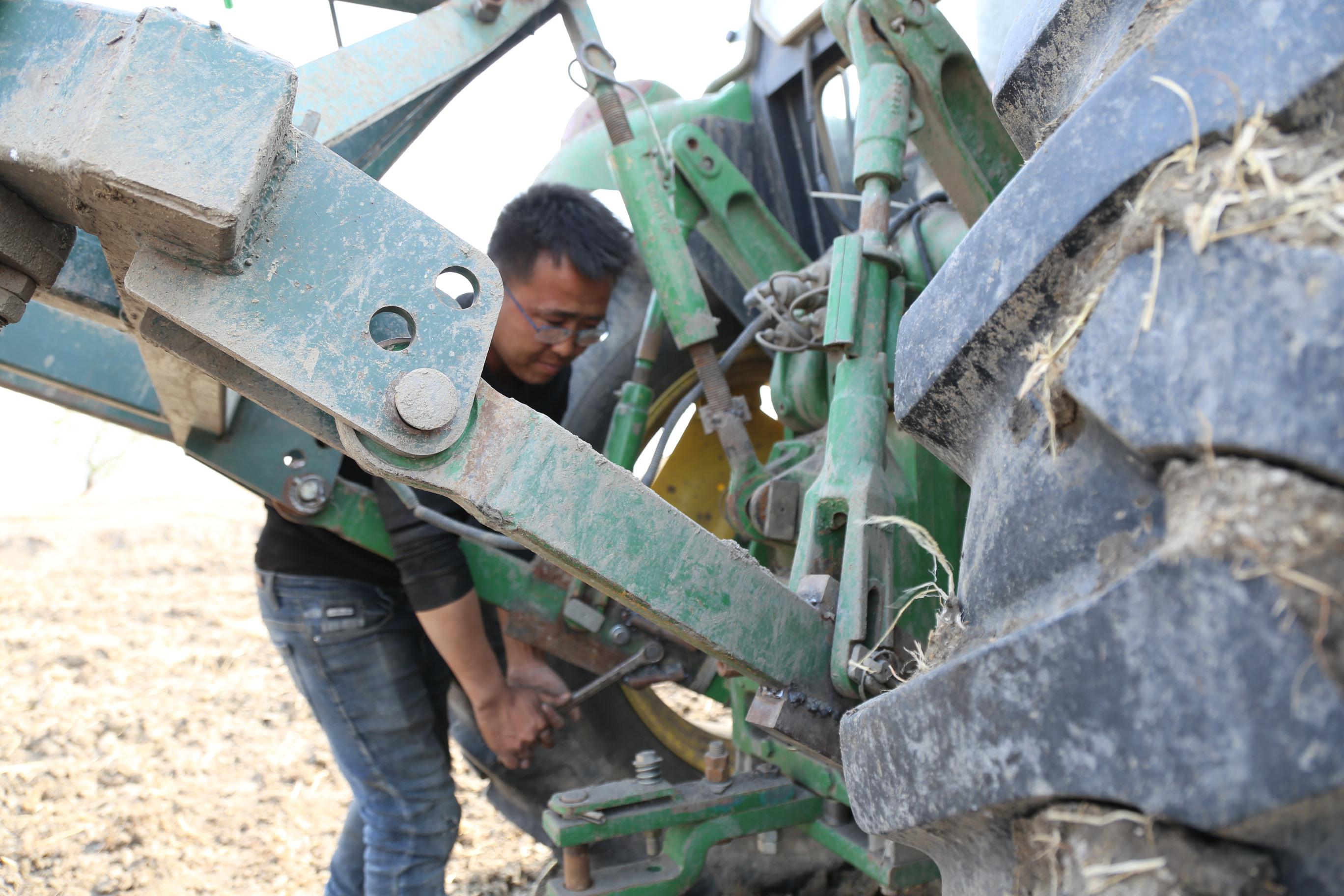 4月8日,崔立磊在唐山市芦台经济开发区西董村检查农机。(受访者供图)