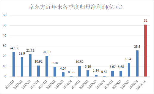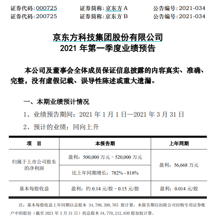 4月12日晚,京东方A发布一季度业绩预告,预计2021年一季度归属于上市公司股东的净利润为50亿元-52亿元,比上年同期增长782%-818%,一季度净利规模有望赶超2020年全年,这是公司20年来业绩表现得最好的单季度。
