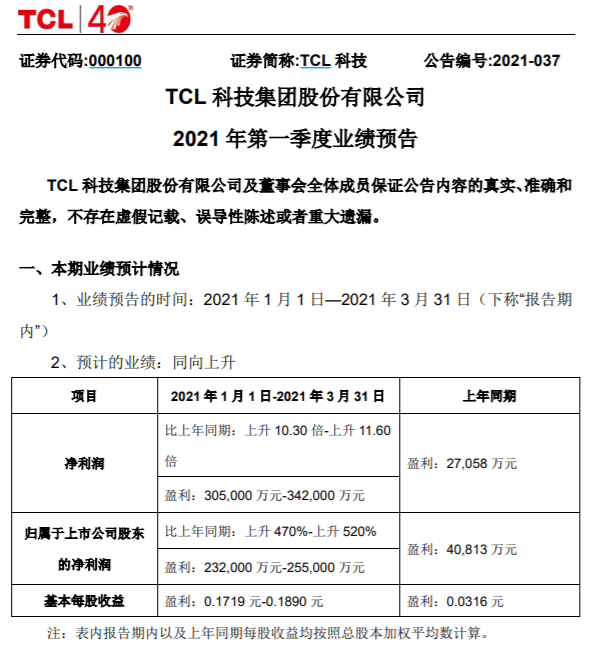 同日,另一半导体显示龙头TCL科技也发布了一季度业绩预告。公司预计2021年第一季度实现归属于上市公司股东的净利润为23.2亿元-25.5亿元,同比上升470%-520%。