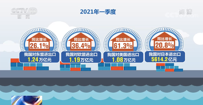 海关统计显示,今年一季度,我国对东盟、欧盟、美国、日本分别进出口1.24万亿元、1.19万亿元、1.08万亿元和5614.2亿元,同比分别增长26.1%、36.4%、61.3%和20.8%。东盟继续为我国第一大贸易伙伴,占我国外贸总值的14.7%。同期,我国与“一带一路”沿线国家进出口合计2.5万亿元,同比增长21.4%,占我国外贸进出口总值的29.5%。