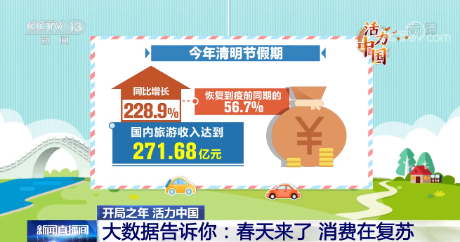 文旅部发布的数据就显示,今年清明节假期,全国国内旅游出游1.02亿人次,同比增长144.6%,恢复到2019年同期的94.5%。国内旅游收入达到了271.68亿元,同比增长228.9%,恢复到疫前同期的56.7%。赏花踏青带出了旅游消费的热度。