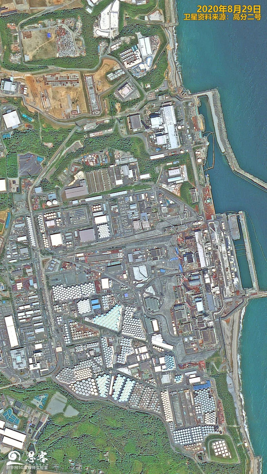 2020年8月29日高分二号拍摄的福岛核电站及周围。卫星影像中可见,周围仍有大片空地可用,污水罐也有些生锈。卫星资料来源:高分二号