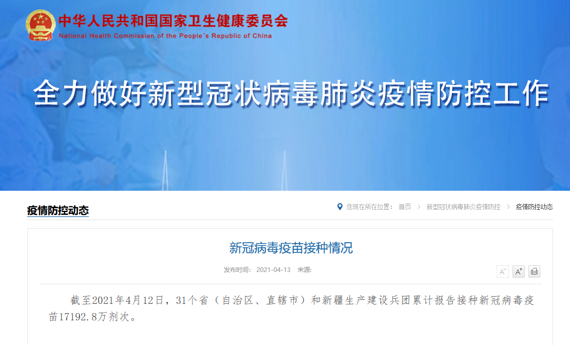 央视网消息:据国家卫生健康委员会网站消息,截至2021年4月12日,31个省(自治区、直辖市)和新疆生产建设兵团累计报告接种新冠病毒疫苗17192.8万剂次。