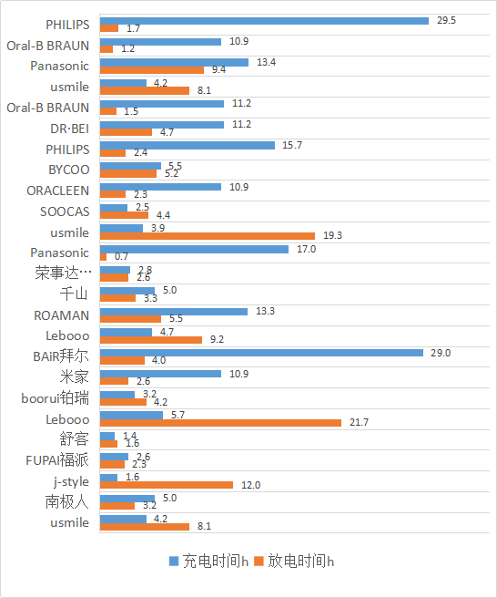 中消协13日发布25款电动牙刷比较试验报告,样品噪声最大超过50分贝,使用者感觉犹如牙钻。此外,样品充电、放电时间差别悬殊,实际充电时间最短为1.4小时,最长为29.5小时;最长放电时间为21.7小时,最短放电时间仅为0.7小时。