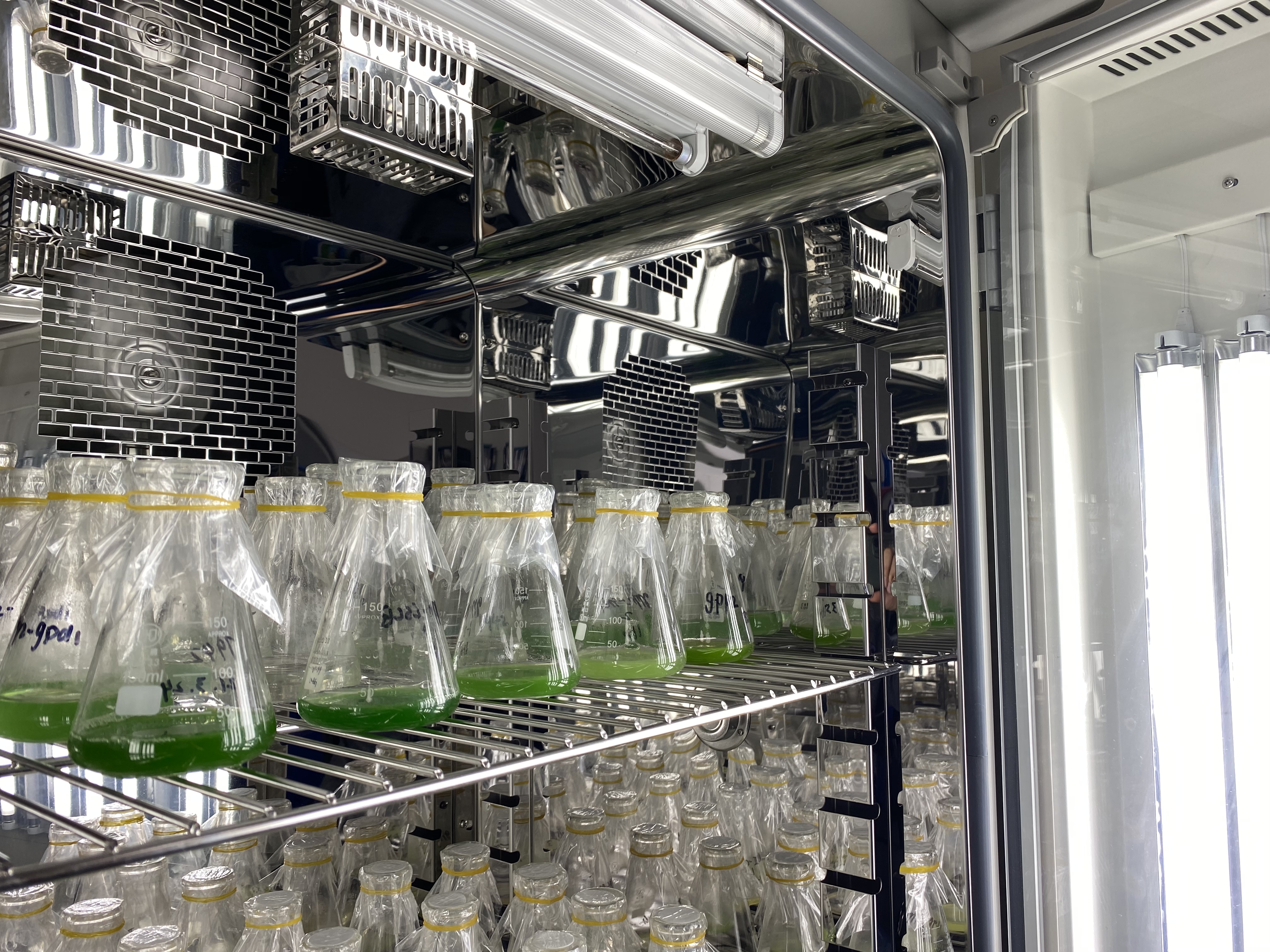 这是一瓶瓶经过不同改造的蓝藻,在这里经过初步培养后,研究人员将对这些蓝藻进行筛选。(受访者供图)